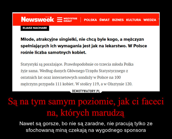 I cóż z tego, że wykształconych kobiet jest więcej niż mężczyzn? One nie wyjdą za kogoś o niższym statusie społecznym. Teraz, kiedy ona ma wyższe wykształcenie – to ona ma wychodzić za mąż za maszynistę kolejowego czy kogoś podobnego?